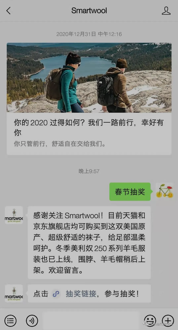 好了,不废话。知道你们等抽奖很久了。本公众号后台回复“春节抽奖”,自动获得抽奖链接,我们将随机抽出2双Smartwool 最近风头正茂的、经典配色的功能袜。2月19日9点自动开奖。欢迎分享给亲朋好友一起抽~ 操作请见下图~