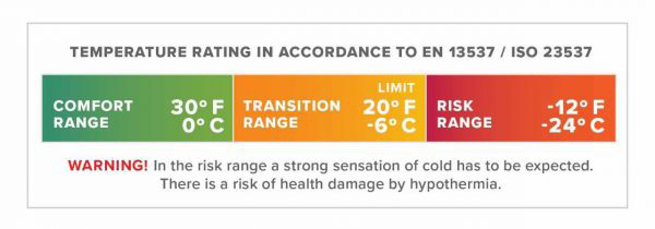 根据EN/ISO标准的语言:“在这个范围内,必须预期会有强烈的寒冷感。有体温过低损害健康的风险。只有在紧急情况下才能在这个范围内使用睡袋。”