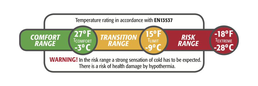 按照EN标准中的措辞,“在此温度范围下,会有强烈的寒冷感觉。存在因低体温而导致健康损害的风险。只有在紧急情况下,才能在此温度范围下使用睡袋;或者必须由具备丰富的经验,知道如何提升睡袋保暖性的人员来使用。”