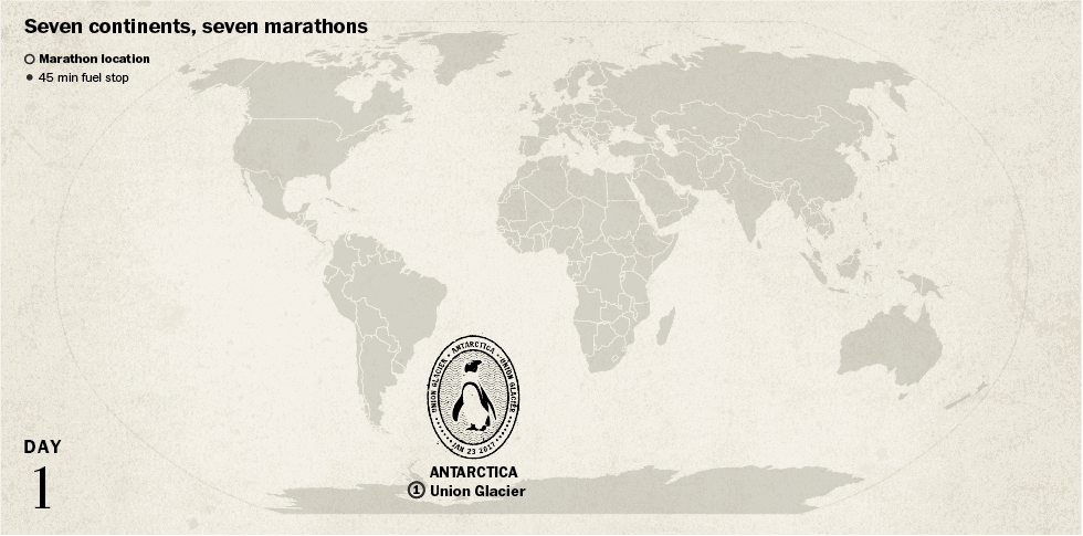 世界马拉松挑战赛,World Marathon Challenge。 7天,在地球上7大洲完成7个全程马拉松。 7天,包含全球范围内的转场时间。 2017年的比赛地点分别是:南极洲联合冰川(南纬80°),南美州的彭塔阿雷纳斯,北美州的迈阿密,欧洲的马德里,非洲的马拉喀什,亚洲的迪拜,和大洋洲的悉尼。每条赛道都由AIMS专家进行测量。 2016 World Marathon Challenge,南极洲站