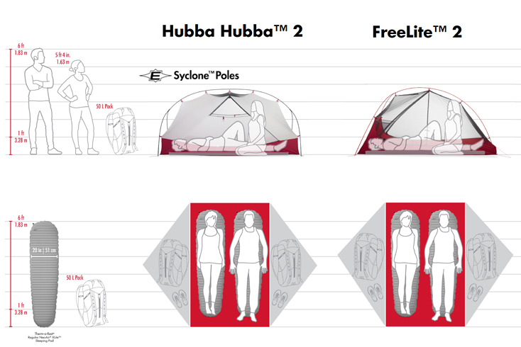 虽然Hubba和FreeLite的帐底面积相同,但Hubba的整个帐内空间更大,因为更多的垂直式帐壁增加了头部、肩部活动空间。Hubba Hubba Shield 2的帐内高度(最高点)为1.01米,而FreeLite 2为1米,这两个相差无几的数字其实并没有真实反映出帐篷轮廓上的差异。由于为内帐提供结构的帐杆更少,FreeLite的帐壁和中心脊线的倾斜度更加明显,尤其是在脚端。高个子用户在FreeLite内的头部活动空间会少一些。