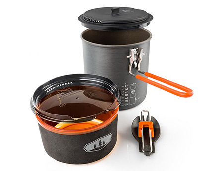 Pinnacle Soloist II 单人炊具套装二代,是轻巧、高效且耐用的极简主义背包客必备的锅具餐具套装,总重309克,只相当于西柚大小。相比于双人套装,配备改为1.1升锅具和一个带隔热套和Sip-It啜饮口盖的杯(兼做碗)。
