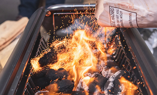 专业提示1:如果您正在烧烤美食,那已经有现成的炭床了,使用耐热工具小心地放低燃料托架(BioLite FirePoker拨火棍非常好用),您可以跳过生火步骤,直接放入大块木柴,篝火就能熊熊燃烧起来了。