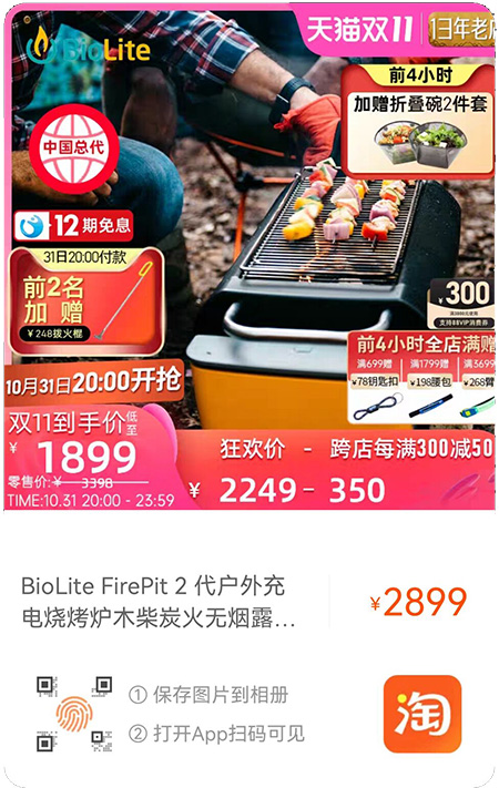 FirePit+烧烤炉参加双11天猫全球狂欢季活动,10月31日20:00开抢,到手价仅需1899元,并有更多福利,现正抢先加购中: