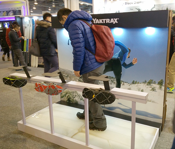 深圳喜马拉雅公司新增的另一个代理品牌——美国专业轻量冰爪品牌Yaktrax,在展位上设置了冰槽,观众可以在自己的鞋子上绑上Yaktrax冰爪,在光滑的冰块上体验“脚踏实地”的防滑效果。