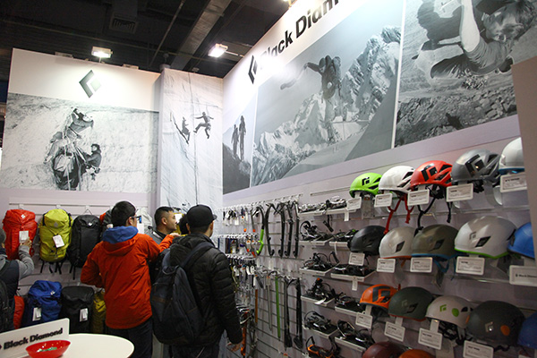 美国专业攀登滑雪品牌Black Diamond展位前人头攒动,众多经销商和爱好者驻足观看攀登和滑雪系列产品。