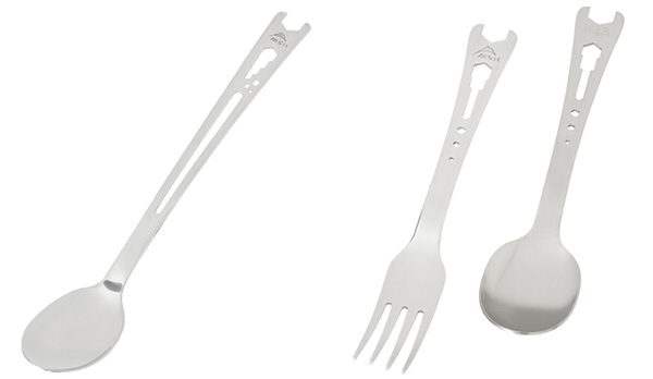 它们在一端都集成了油炉喷嘴和线缆工具,另一端当然是用来吃饭的,一物多用,减轻负重嘛。餐勺的长柄,方便使用深锅或是袋装速食食品。
