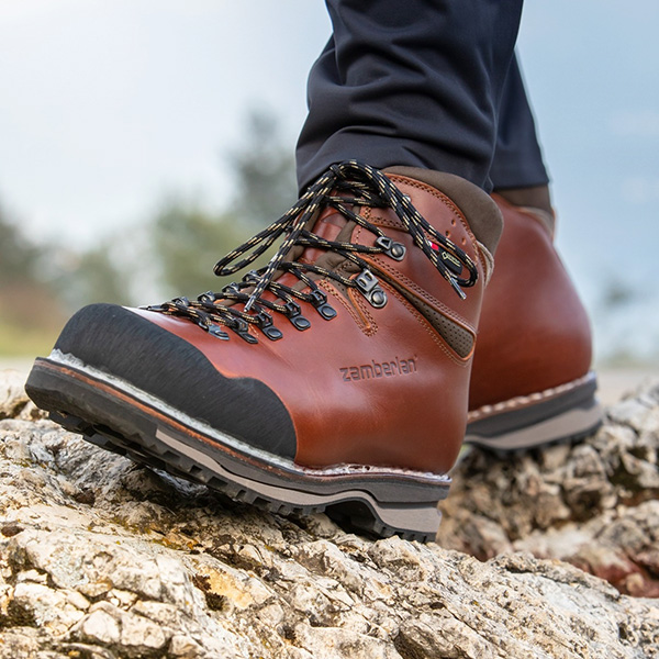 重装徒步时的背负重量绝大部分会通过髋、腿传递到双脚上,额外的重量增大了人在行走时双脚在鞋子里滑动的趋势,如果没有硬实的鞋面束缚住这种趋势并把力通过鞋面尽可能地传递到鞋底部分,这种反复“揉搓”的力很快就会令双脚感到酸痛,这就是为什么鞋面柔软的鞋子不能用在重装徒步上的原因。Zamberlan的1025 Tofane NW GTX RR是Zamberlan徒步靴产品线中的明星款,以经久耐用著称(男款重970克,女款重790克),鞋面采用的是产自意大利托斯卡纳地区的2.6-2.8毫米厚经Hydrobloc处理的高品质涂蜡Vesta全粒面皮革,这是皮革中最为坚固耐用的部分,更加防水和耐用。1025是全包裹脚踝防崴脚的高帮款型,侧帮上厚实的皮革并没有妨碍行走崎岖路面时脚踝的弯曲,这是因为1025在鞋口位置采用ZFS技术,通过符合人体工学的剪裁,让鞋面不会影响脚踝的自然弯曲,同时提供出色的侧向支撑。鞋面前端包裹硬实的橡胶护边,即使鞋尖踢到石块上也能保护脚趾安然无恙。重装徒步对GORE-TEX防水薄膜的可靠性要求更甚于透气性,所以1025采用的是GORE-TEX Performance Comfort技术。1025加大了鞋头位置的空间,重装行军时让脚趾有足够的活动范围。